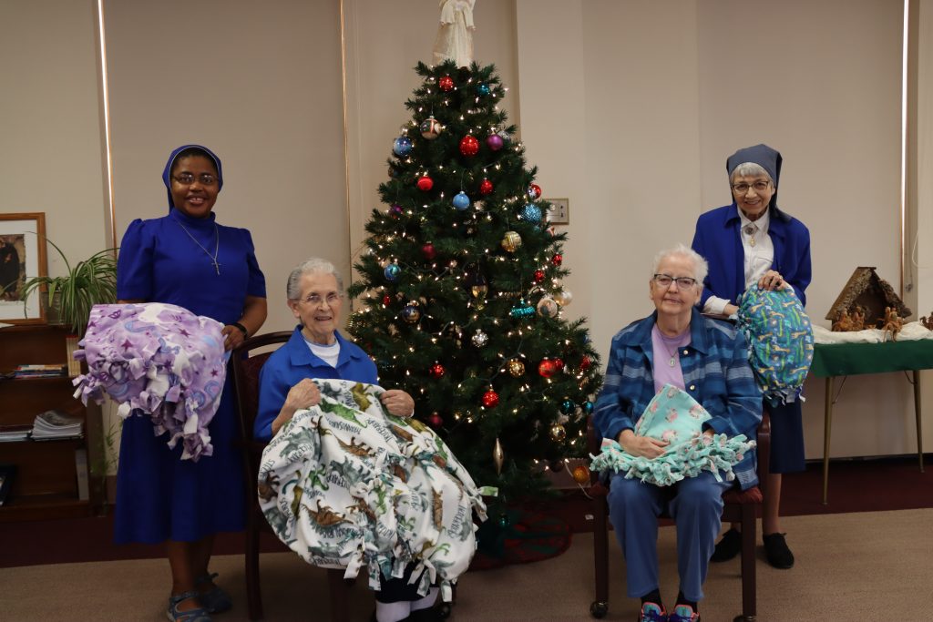 During their Wellness Christmas celebration, Mother House Sisters gathered for a simple yet meaningful act of service, creating beautiful, cozy tie blankets for those in need of comfort during difficult moments. Made by hand and carefully knotted with intention, these blankets will be donated to the Leavenworth Police Department to be shared with individuals facing stressful or traumatic situations.